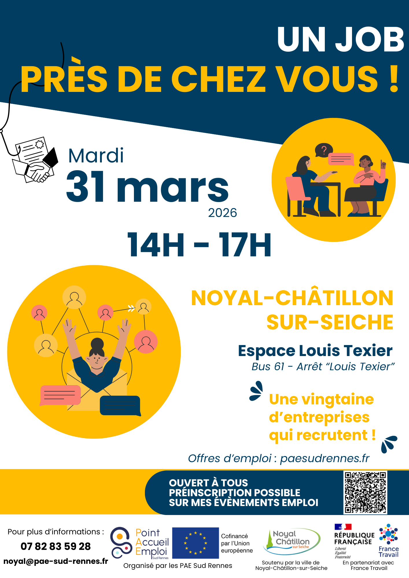 Objectif : proposer un moment de rencontre convivial entre candidats et entreprises locales. Ce forum, intitulé « Un job près de chez vous », réunit une vingtaine d’entreprises qui recrutent dans différents secteurs et permet à chacun de venir déposer son CV, discuter directement avec des recruteurs et découvrir des opportunités d’emploi sans inscription préalable.